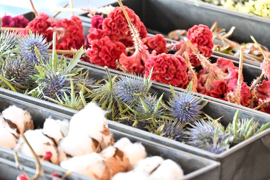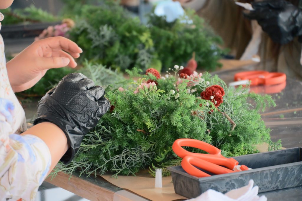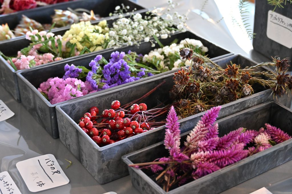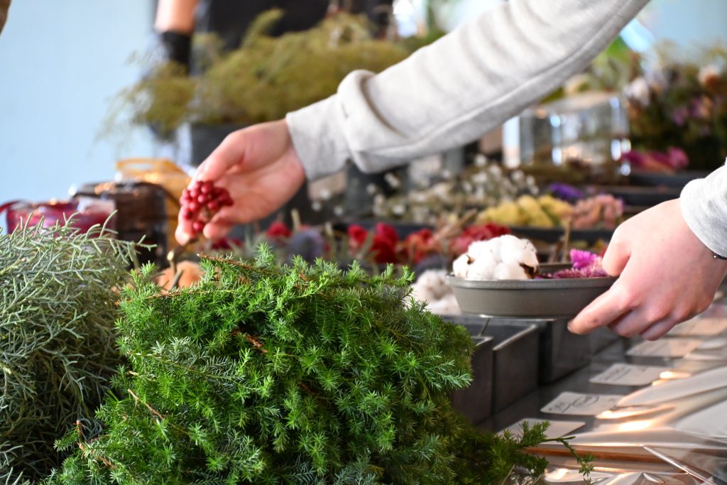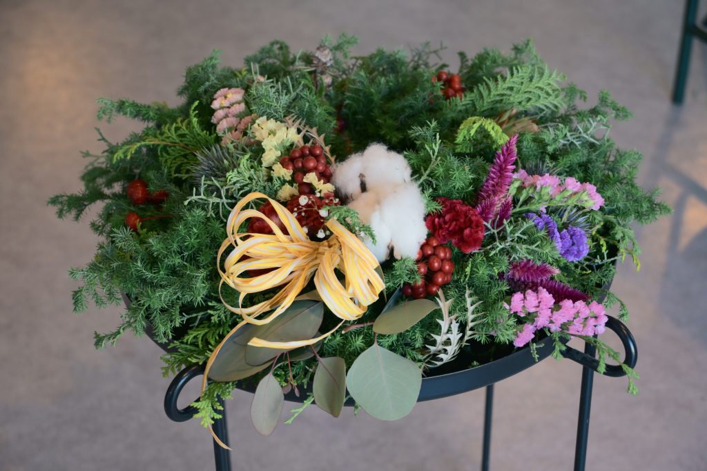 土台が完成したら、次はアクセントとなる花材を選んで組み込んでいきます。赤い実をポイントにしたり、ふわふわのコットンや鮮やかなケイトウをあしらったりと、それぞれの個性が光ります。