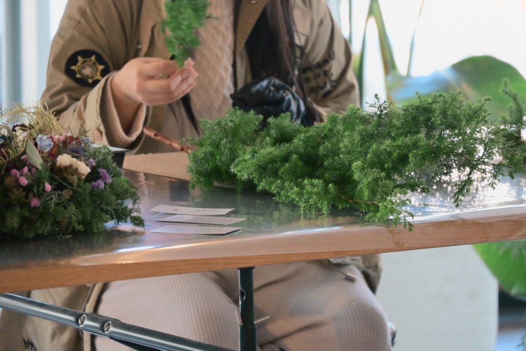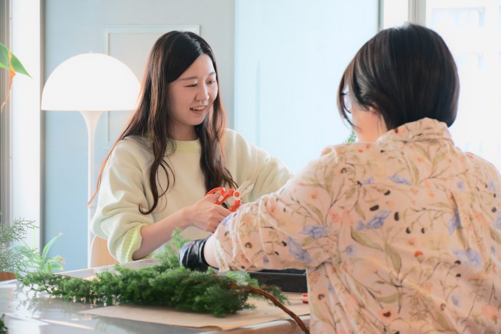 まずはリースの土台づくりから。3種類のグリーンを作りたいイメージを考えながらカットして、リースの土台に巻きつけていきます。土台が隠れるように少しずつ重ね、ワイヤーで止めていく作業はシンプルですが、意外に難しい様子。