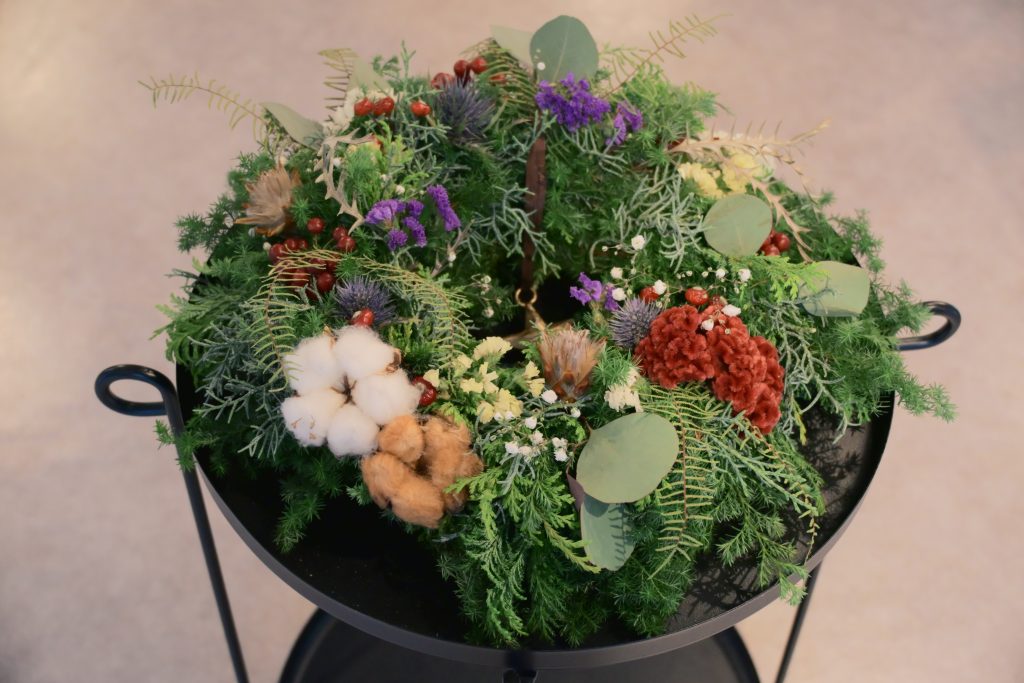 会場となった2階リビングのテーブルには、グリーンを中心にバラの実やコットン、ユーカリ、リューカデンドロン、スターチス、ケイトウ、エリンジウムなど、冬を彩るさまざまな花材がずらりと並びました。種類が多くてどんなリースにしようか迷ってしまいます。